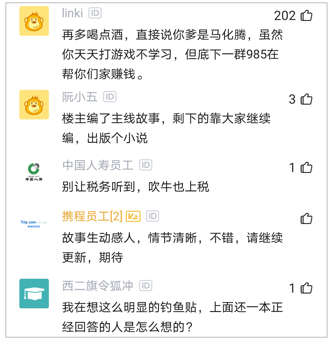 也有不少网友怀疑这个帖子是钓鱼贴:楼主编了主线故事,剩下的靠大家继续编,出版个小说。