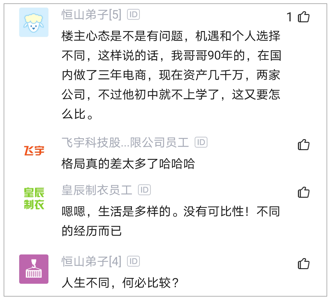 此外,楼主也解释了:我高中是市重点,学校实行散养政策,除了周一升旗不用穿校服,不分尖子班,学习靠自觉,老师基本不管。我高考发挥失常,最后班上倒数。我平时模拟考是普通211的水准,后面去了一个比较强得二本。刚来脉脉,看到大家都炫耀工资,有点膨胀,如果让你心态不好了,对不起。现在我硕士毕业两年半,年初跳槽刚拿到谷歌L4的包裹(之前我在亚马逊),女朋友比我小一岁在亚马逊是SDE1。