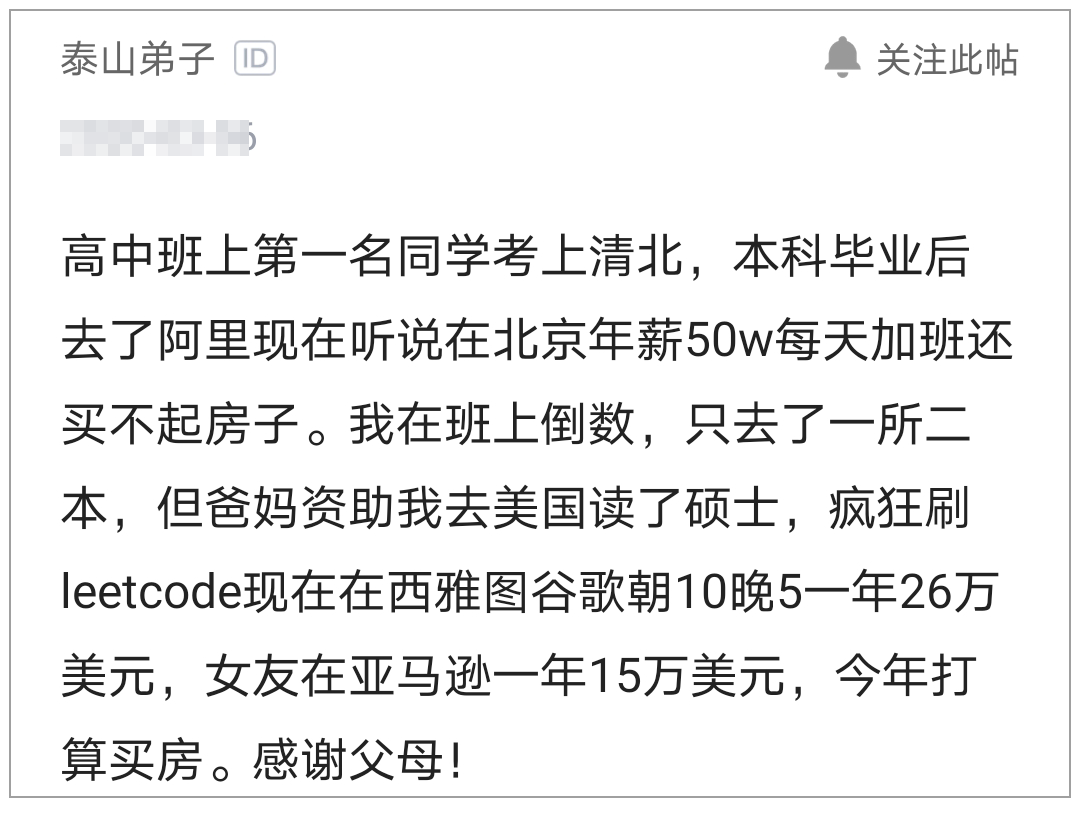 近日,有位网友在社交论坛脉脉上发帖称:“高中同学考上清北,毕业后年薪50w每天加班还买不起房子,自己班上倒数,去了二本,现在在谷歌朝10晚5一年26万美元,女友在亚马逊一年15万美元,准备买房了。”引发热议。