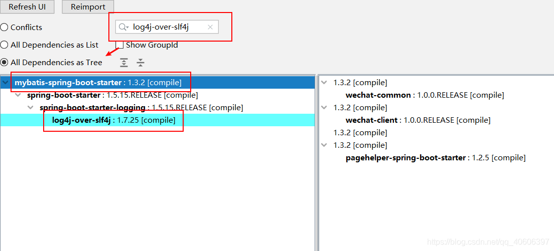 就可以进行对具体jar包的树状位置定位,如下图,我对log4j-over-slf4j进行模糊匹配,立刻得到了对应包的父依赖,如此就可以进行exclusion去包操作。