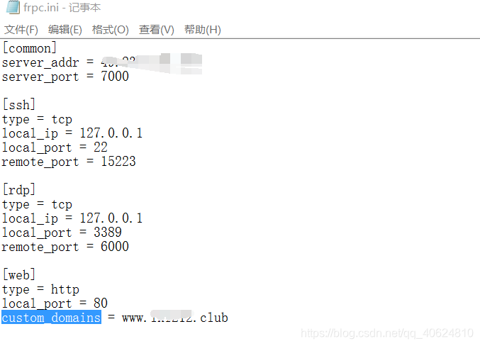 3389端口没转发成功,尝试了下将内网的80端口转发到公网2222端口。其中custom_domains为我服务器解析的域名。