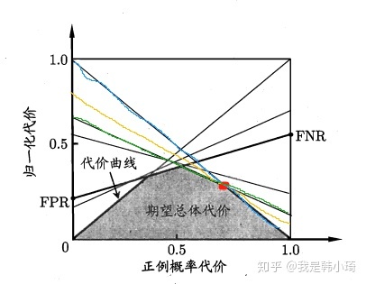 ps. ROC曲线对应着唯一条代价曲线,但是一条代价曲线可对应着多条不同的ROC曲线,如上图中,在绿、黄、蓝三条线段交于红点时,此时去掉黄色线段代价曲线是不会发生变化的,但是ROC曲线则会少一个点。
