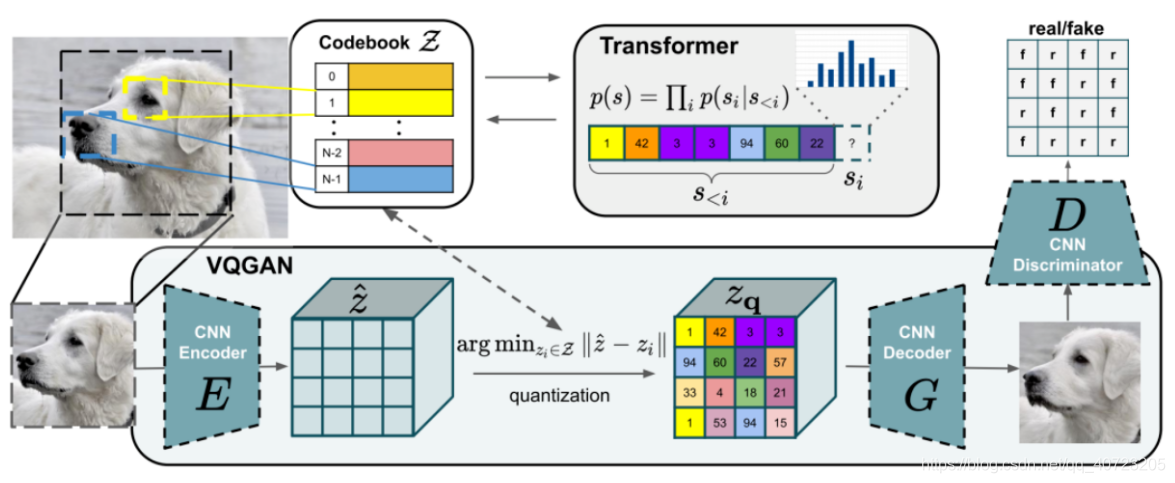作者使用卷积VQGAN来学习上下文丰富的视觉部分的codebook,codebook的组件随后用自回归transformer 架构来建模。离散的codebook提供了这些架构之间的接口,基于patch的判别器实现了强大的压缩能力,同时保持了较高的感知质量。该方法引入了卷积方法在基于transformer的高分辨率图像合成中的有效性。