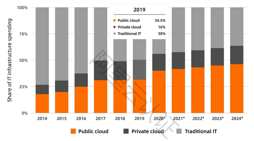 IDC发布报告《全球云计算IT基础设施市场预测》,在2019年,云对IT基础设施产品的购买,第一次超过传统数据中心的购买量。50%拐点出现在云计算和传统IDC之间,云拐点已至。