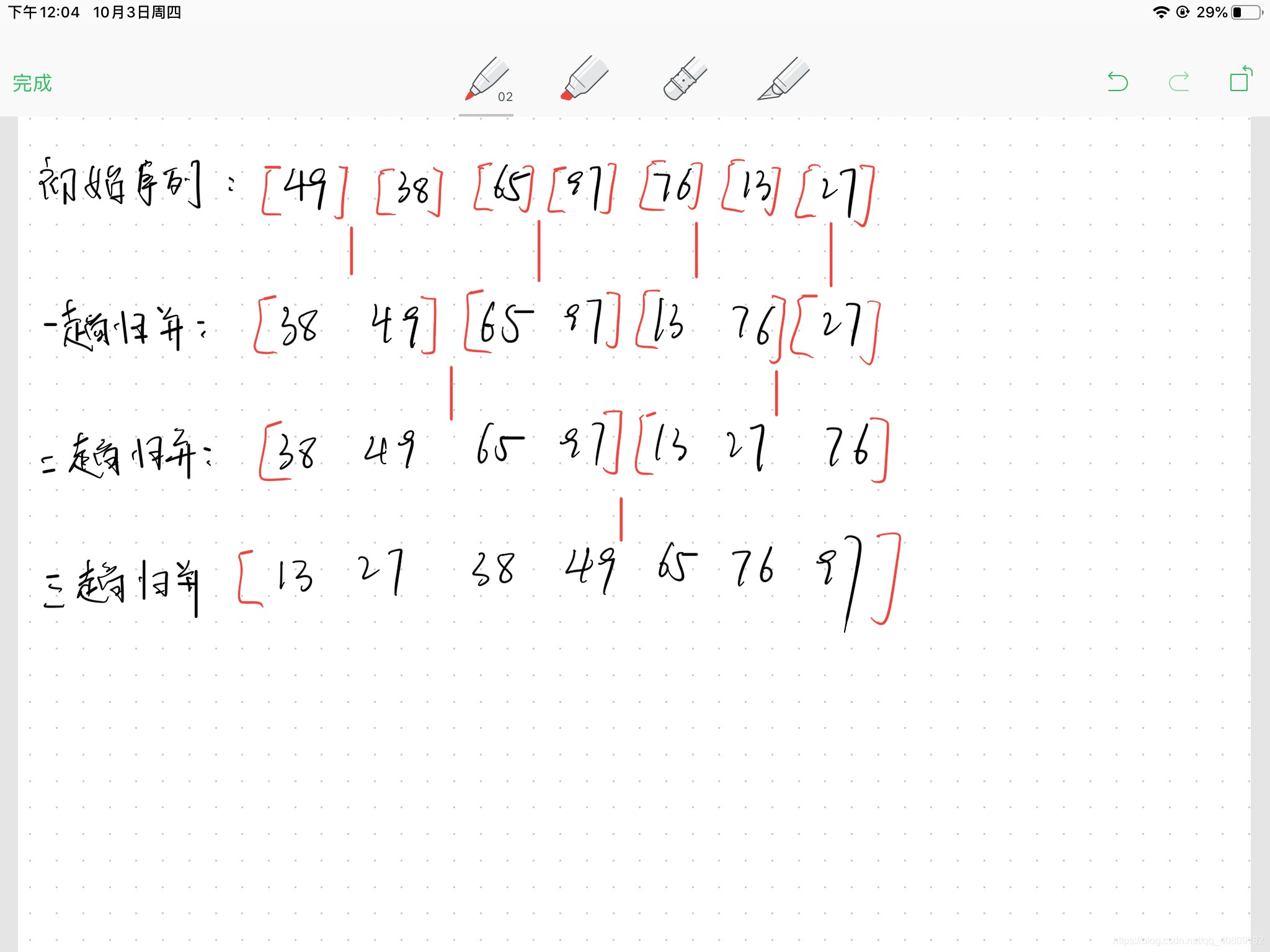 将待排序序列中的前后相邻的的两个序列合并成一个有序序列