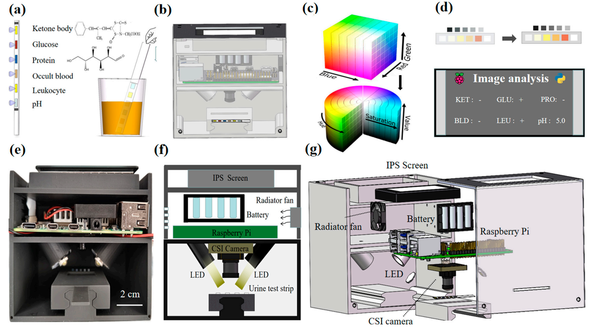 论文阅读:《An Optical POCT Device for Colorimetric Detection of Urine Test Strips...》 在本研究中,作者提出了一种基于光学POCT设备的多分析物纸张传感阵列的简单可靠的比色方法。所提出的颜色校正算法有效地消除了外界光线的影响。此外,在没有参考设备的情况下,使用H和S参数从数字彩色图像中提取定量分析信息。通过调节灯的亮度、灯的类型、灯的角度和相机的高度来优化比色法的葡萄糖传感条件。检测结果表明,该方法对尿液试纸条中各指标的定量分析具有较高的准确性,对浓度的分辨率也有所提高。作者建立了一种用于快速、灵敏和自动光学检测的POCT设备,该设备可用于分析实际尿液样本或与其他试纸进行体外诊断。