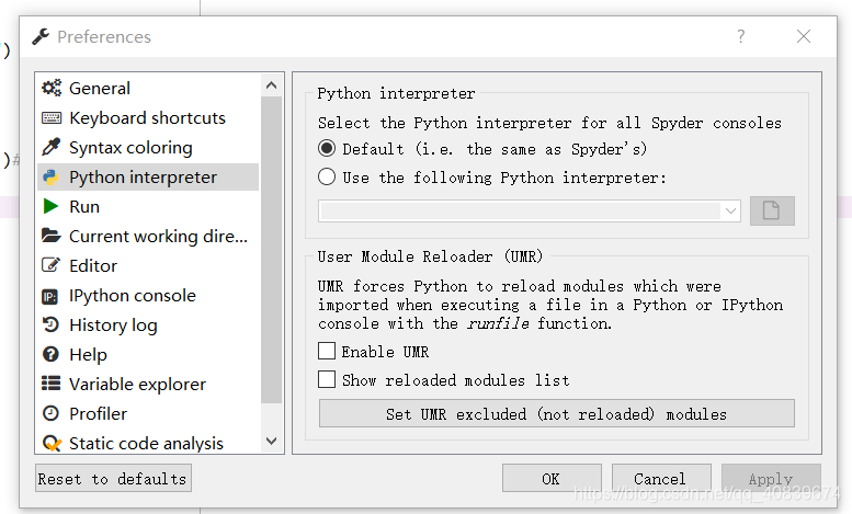 本文介绍了如何在Spyder集成开发环境中关闭UserModuleReloader(UMR)功能,通过取消勾选Tools菜单下的Preferences->Python Interpreter中的Enable UMR和Show reloaded modules list选项,然后重启kernel,从而避免不必要的模块重新加载问题。