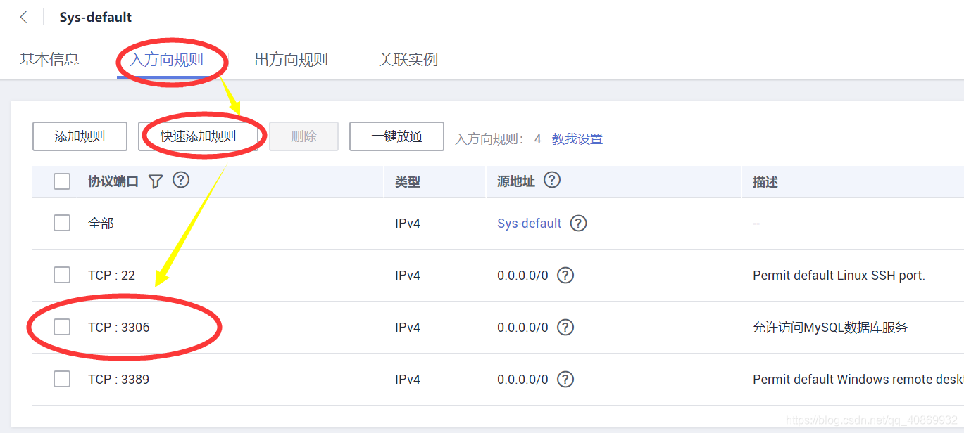 如图所示:您先查看一下新的安全组上端口3306是否打开