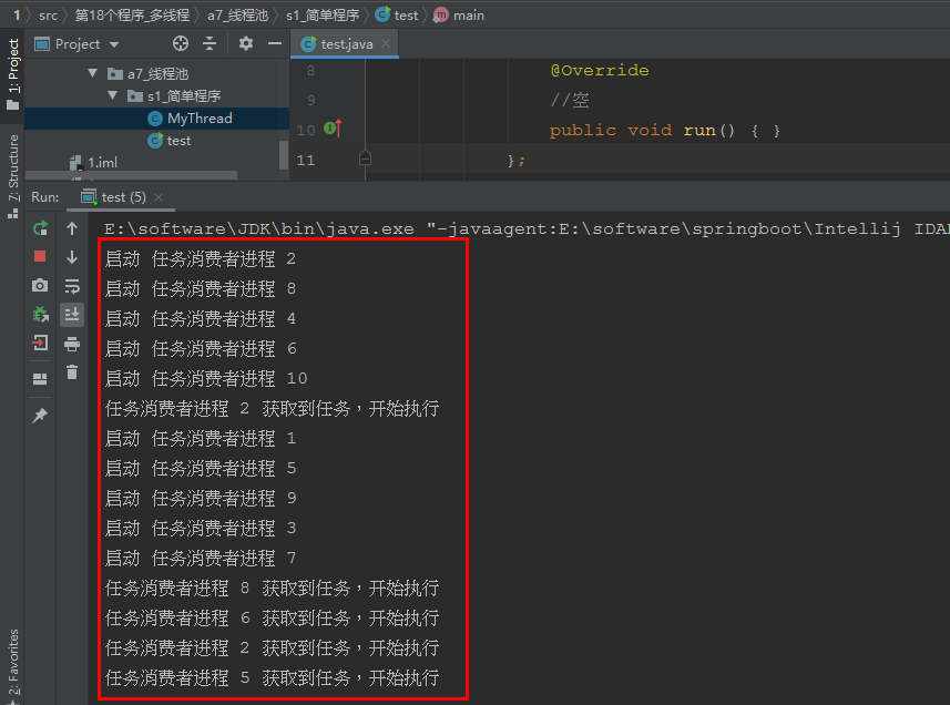第 1 个参数10:该线程池初始化了 10 个线程工作