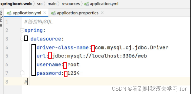 yml配置文件的编写 2.如何编写yml:是以k-v键值对编写,如图k-v之间的层级做区分是红色部分 只需要有空格就是另一个层级。像蓝色部分之间的黑色的空格同样是代表层级,空格数量相同相当于在同一个根目录下是同层级的 ,如spring目录下。1.配置文件有properties>yml>yaml(优先级),一个项目通常选一种类型就可以,目前主流的是yml,yml和yaml无差别,yml和properties相比编写是明显差异的,yml是分层级的所以简洁美观。