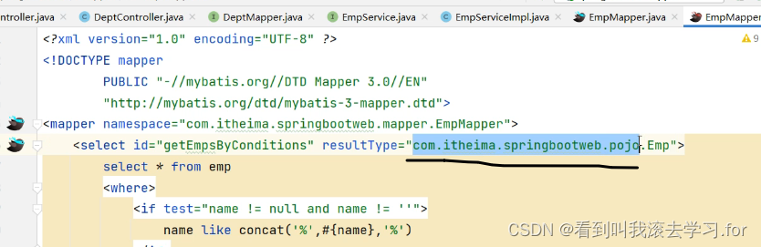 xml映射文件 的编写入门教程 1(此处只是做了模糊,不必过多关注)指的是映射文件的地址 一致。2指的 方法名即id 一致。3指的数据库表的字段和对象属性一致就用resultType类型,并指定java对象的地址。如图解释1:在resource下面建立同级的包名(写包名时可以用斜线 划分层级,如 com\example\springbootbatis2,包建立完可以用。一些公司为了阅读美观,也是为了解耦将业务代码和sql编写分开,所以xml编写sql很常见。查看是建立的多久目录还是一个很长名字的目录 进行确认)。