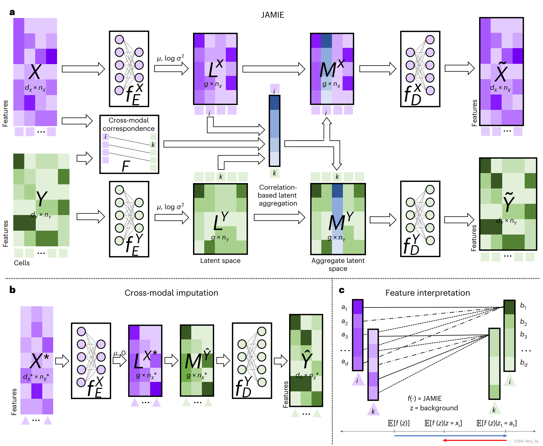 单细胞多模态数据集测量了单个细胞的各种特征,从而能够深入了解细胞和分子机制。然而,多模态数据生成仍然成本高昂且具有挑战性,并且数据经常存在dropout。为了解决这些问题,作者开发了JAMIE。JAMIE获取单细胞多模态数据,这些数据可能具有跨模态部分匹配的样本。变分自编码器学习每个模态的潜在嵌入。然后,在重建之前,将来自匹配样本的跨模态嵌入聚合以识别联合的跨模态embedding。为了进行跨模态插补,可以将一种模态的潜在嵌入与另一种模态的解码器一起使用。对于可解释性,Shapley值根据跨模态输入和已知标签样本的输入特征进行优先级排序。