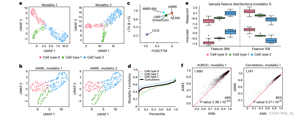 - f、JAMIE与基线KNN的模态1的插补性能,通过AUROC和correlation进行评估。