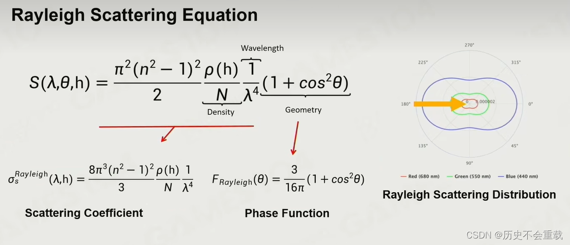 所以要做出更加真实的大气效果,就要从真实大气散射出发,这里给出了两种散射模型,瑞利散射(Rayleigh Scattering)和米氏散射(Mie Scattering) 。像空气分子这样的比光的波长还要小很多的颗粒引发的散射,我们称之为瑞利散射。发生瑞利散射时,光的波长越短,散射程度越强。由较大的颗粒引起的散射,称之为米氏散射。米氏散射的特征是所有波长的光均等发生散射。因此,各种波长的光混合在一起,使散射光和太阳光一样呈现白色。
