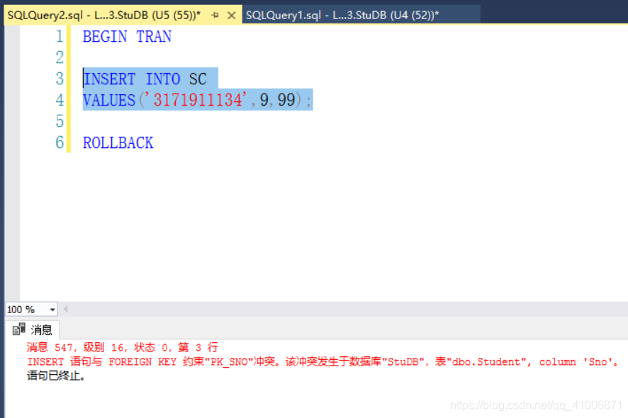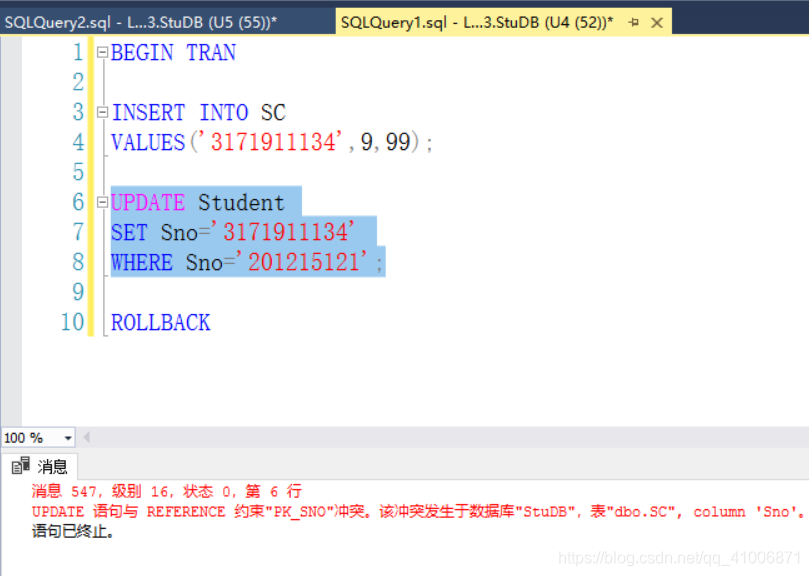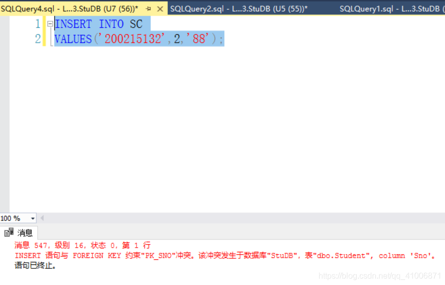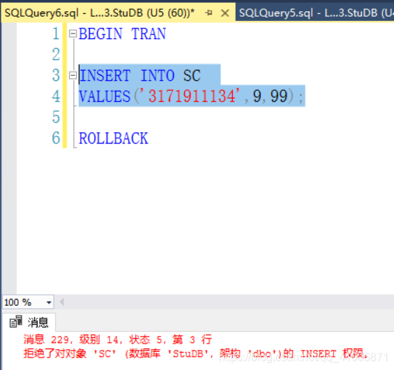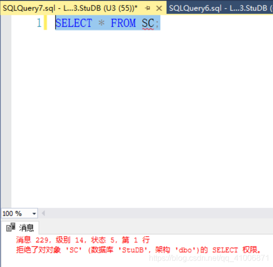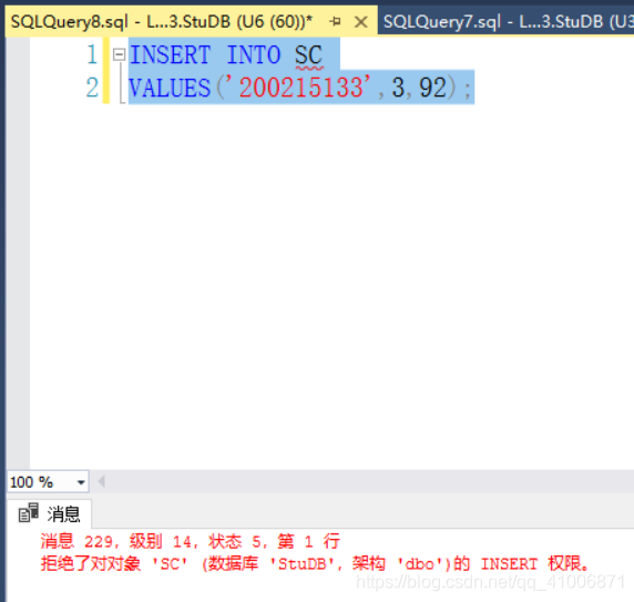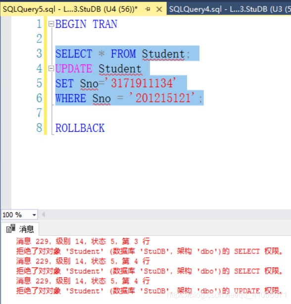 授权后:(因为Sno是Student表的主码,在级联表进行添加肯定是无法运行成功的。) [1-6] 用户U5将对表SC的INSERT权限授予U6,并允许将权限转授给其他用户。 GRANT INSERT ON SC TO U6 WITH GRANT OPTION [1-7] 用户U6将对表SC的INSERT权限授予U7。 GRANT INSERT ON SC TO U7; (3)在授权之后验证用户是否拥有了相应的权限。 在执行完上面七个语句之后,我们可以分别以不同用户的身份登录数据库,进行相关操作,检查系统是否许可。例如: [1-8] U4更新Student表的学生学号。 以下截图的结果是符合的,可以验证U4拥有这个功能的权限,说明他是有条件可以可以更新的,但因为这个学号的属性是级联的关系,要先在SC表里的学号先进行更新,然后才能在Student表进行更新。 [1-9] U7向SC表中插入一条数据:(200215132,2,88)。 以下截图是可以验证U7是拥有这个功能的权限的,因为在SC的Sno是级联的关系,要先在Student表先进行插入后,才能在SC表里进行插入。 二、回收权限 (1)回收权限 [2] 回收权限。将[1]授予的权限部分收回。
