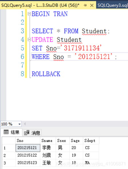 授权后: U2: U3: [1-3] 把对表SC的查询权限授予所有用户。 GRANT SELECT ON SC TO PUBLIC [1-4] 把查询Student表和修改学生学号的权限授给用户U4。 授权前: GRANT SELECT,UPDATE(Sno) ON Student TO U4; 授权后:(修改学号的截图不能实现,因为它的学号跟另外一张表是级联的,除非先另外一张才可以改这张) [1-5] 把对表SC的INSERT权限授予U5用户,并允许他再将此权限授予其他用户。 授权前: GRANT INSERT ON SC TO U5 WITH GRANT OPTION