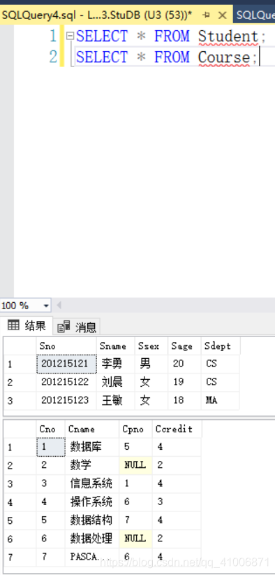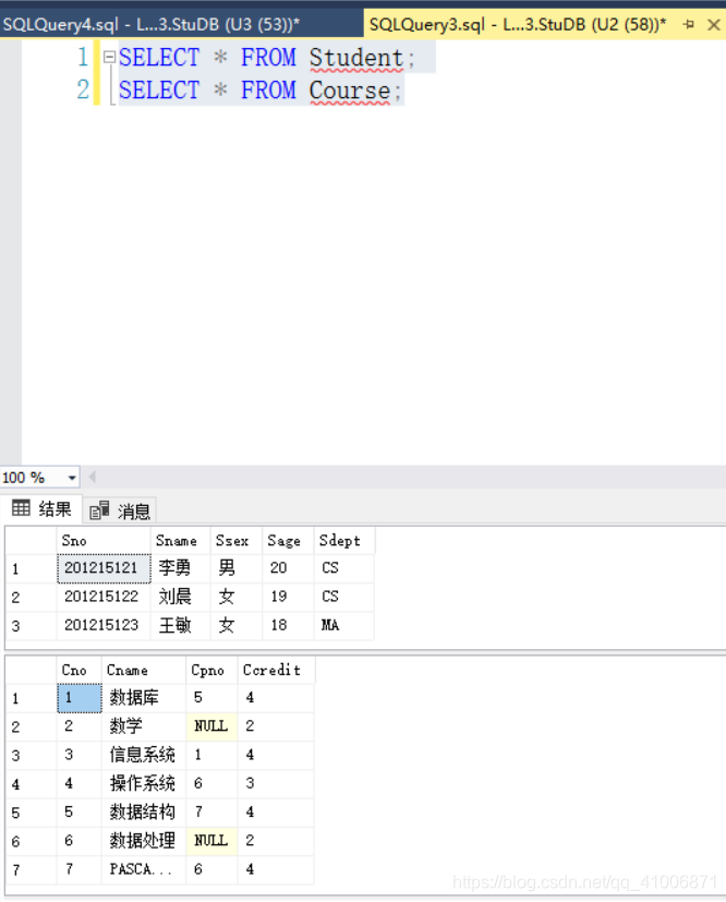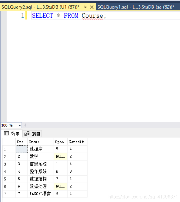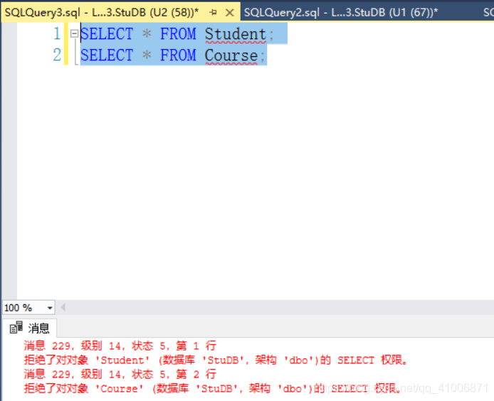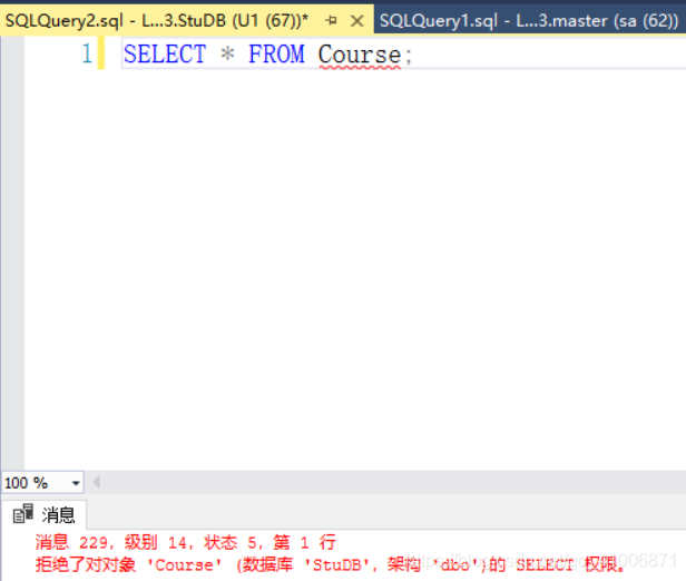 EXEC SP_GRANTDBACCESS U1,U1; EXEC SP_GRANTDBACCESS U2,U2; EXEC SP_GRANTDBACCESS U3,U3; EXEC SP_GRANTDBACCESS U4,U4; EXEC SP_GRANTDBACCESS U5,U5; EXEC SP_GRANTDBACCESS U6,U6; EXEC SP_GRANTDBACCESS U7,U7; (2)在DBA(在SQL Server中是以sa这个内置的管理员身份登录查询分析器)与七个刚建的用户之间进行授权 [1-1] 把查询Course表权限授给用户U1。 授权前: GRANT SELECT ON Course TO U1; 授权后: [1-2] 把对Student表和Course表的全部权限授予用户U2和U3。 授权前: U2: U3:
