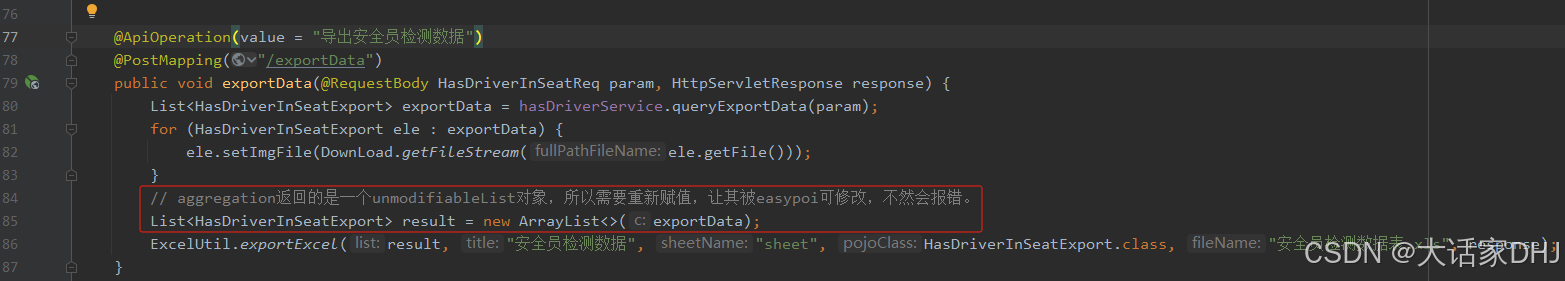 EasyExcel复杂表头导出(一对多) 关于EasyPoi 框架的问题,在此不再赘述,参考我的另一篇博客,地址如下:EasyExcel复杂表头导入(一对多)_间歇性悲伤患者的博客-CSDN博客_easyexcel复杂表头实际上,官方文档和网上都没有详细的导出教程,需要自己参考官方去实现。我搞了半天只弄成功了一个半桶水的,十分惭愧,在此记录一下,方便回溯。说明:EasyExcel无法处理List里面嵌套List的情况,我采用的方案是通过表格合并的来实现。下面,先给出具体实现,然后再谈谈问题。Controller 层getDate方法