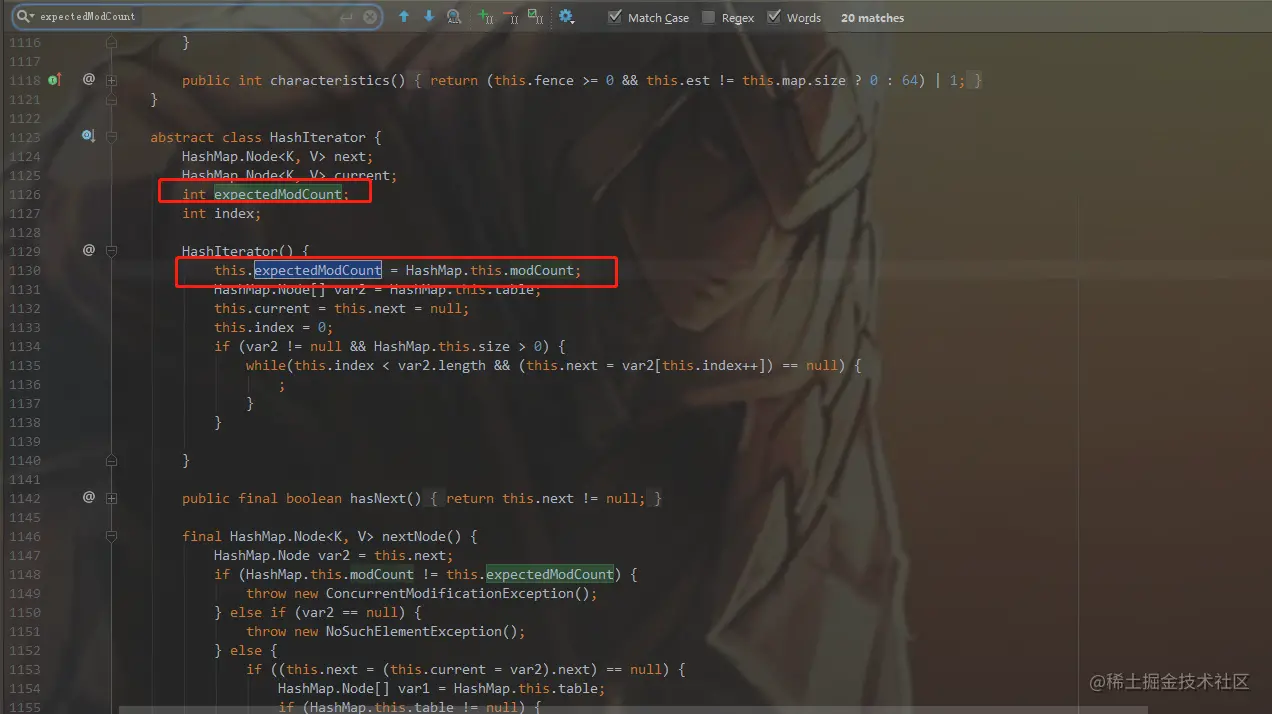 这里对modCount进行了自增操作,表示操作动作+1。再看modCount和expectedModCount是什么东西