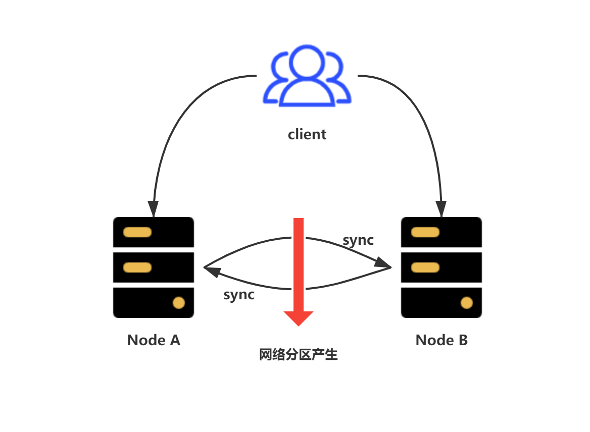在上图中当网络分区产生的时候,分布式节点之间无法进行通信,数据无法及时同步,此时客户端对Node A节点数据的修改无法同步到Node B节点上,这会导致分布式系统中数据不一致,一致性(Consistency)将无法得到保证,如果此时要保证分布式系统中数据一致性,那么只能停止提供服务,等待节点网络恢复数据同步之后,在提供服务,但是这样系统就无法满足可用性(Availability)。