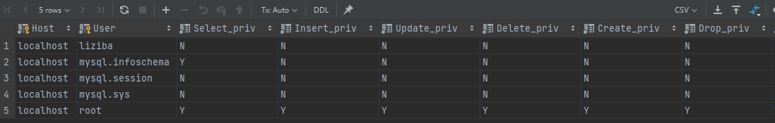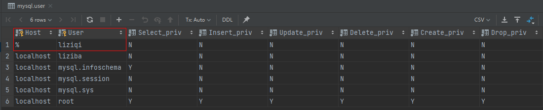 重新查询用户 select * from mysql.user,发现此时user表中新增了一条记录,值得注意的是,此时liziba这个用户,权限项的值都是N,表示当前用户并没有任何权限,这里就是后面会讲的用户授权。