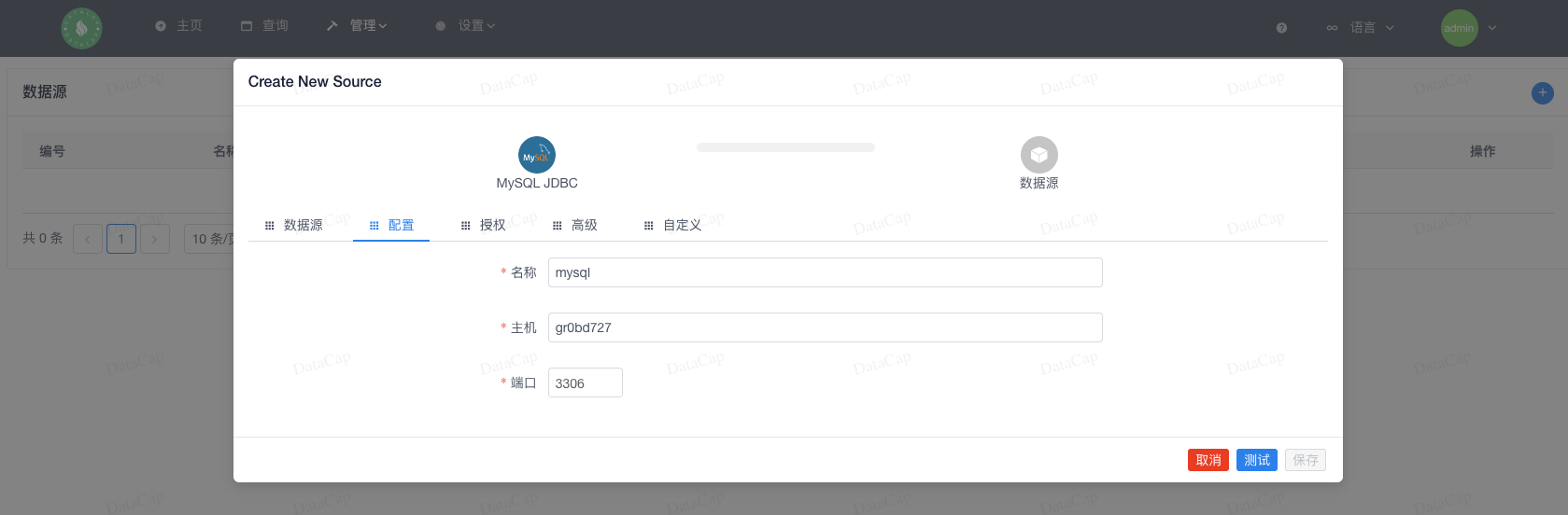 中配置 MySQL 访问地址,这里可以配置 DataCap 使用的 MySQL,访问地址可在 MySQL 组件 -> 端口