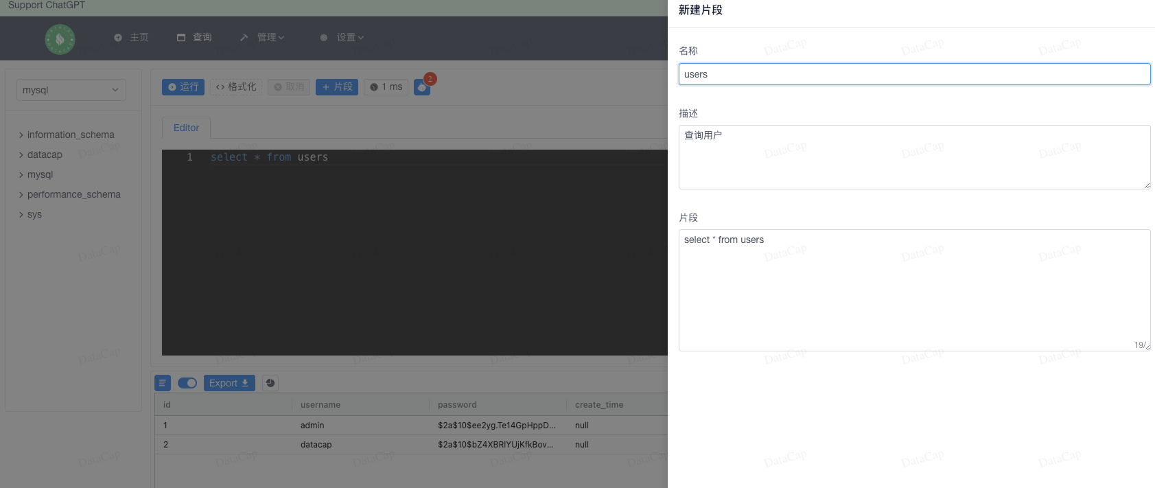 DataCap 还有更多好用的功能,比如 执行历史、函数、SQL模板,还集成了 ChatGPT 用于 SQL 优化,不过我的 ChatGPT Key 过期了,就不多描述了,有兴趣的小伙伴可以安装体验下。