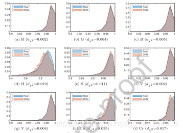 Haodong Li[5] 等人在研究如何对抗由GAN网络生成的篡改图像的过程中,还发现了另一条规律,即deepfake与真实图像在残差域里所体现出的差别,在不同的颜色空间中的不同分量上,可以体现的更明显。作者分别对图像的原像素域和残差域在三种颜色空间(RGB、HSV、YCbCr)中的各个分量进行了统计学分析,从统计结果中找出这种差异最显著的分量(即H、S、Cb、Cr)。