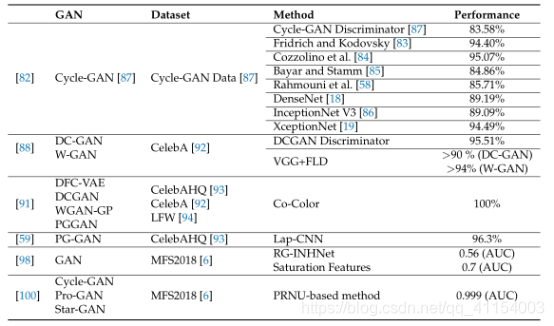 Pengpeng Yang[2]中还给出了几种检测方法对各个GAN网络生成的图像的检测能力汇总。