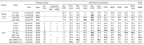 Sheng-Y u Wang[4] 等人认为DNG图像可以通过训练一个简单的分类器很容易就检测出来。他们使用ProGAN生成了大量篡改图像,将生成的图像和原图像混合作为训练集,然后训练了一个基于ResNet-50的分类器对输入图片是否为篡改图像进行二分类。使用由多种不同的GAN网络生成的图像进行测试,并对测试集进行了JPEG压缩,高斯模糊等后处理,以证明这种简单的方法对于检测所有DNG图像的泛化性,以及对后处理的鲁棒性。他们的分类结果如下。
