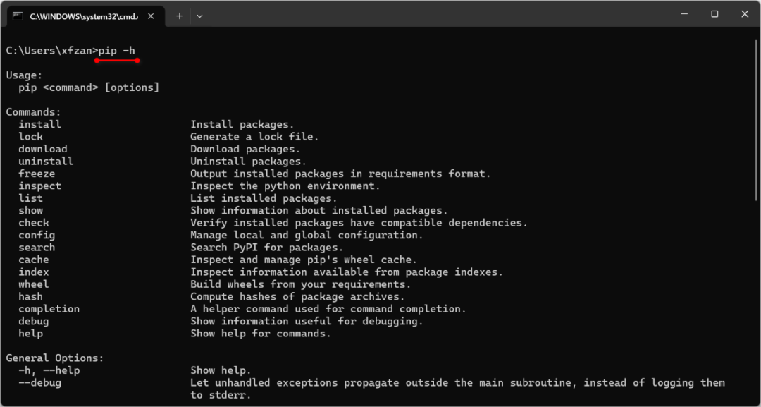 pip <command> [options]使用 Python 的 pip 模块执行子命令,可通过 <command> 传入功能操作,再附带所需选项参数。
