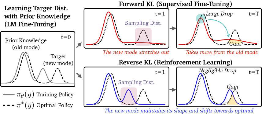 ● 将 SFT 视为最小化 forward KL(mode-covering),将 RL(带 KL 正则的 RL)视为最小化 reverse KL(mode-seeking)。在把目标分布建模为“先验知识模式 + 新任务模式”的混合分布后,作者推导并演示:当初始策略为多模态时,mode-seeking(即 RL)更有可能保持旧模式不被抹掉,从而较少遗忘;相反在单峰(uni-modal)初始策略下,forward KL 可能更稳健。