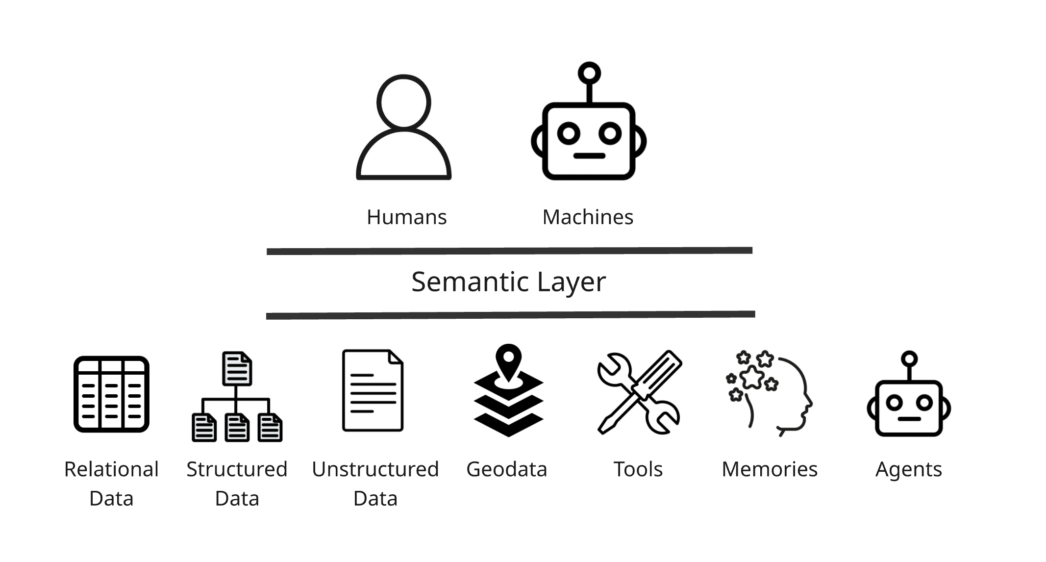 语义层定义:为所有数据附加机器/人可读的元数据,使 AI 能一致地理解、检索、推理与治理这些数据。文章指出:只在关系型数据上做语义层不够,必须覆盖非结构化/半结构化数据、工具和记忆,结合图技术与图书情报学方法。