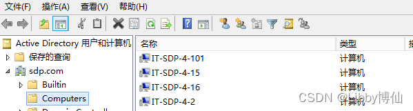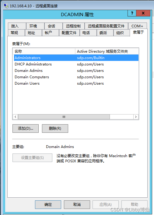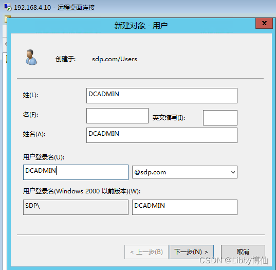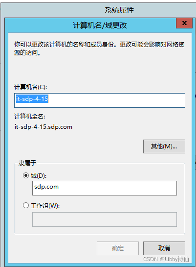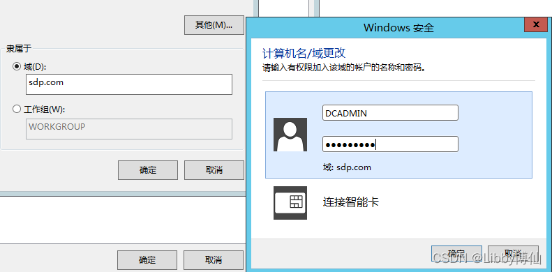 计算机→属性→计算机名→更改→隶属于sdp.com 填写DCADMIN以及密码