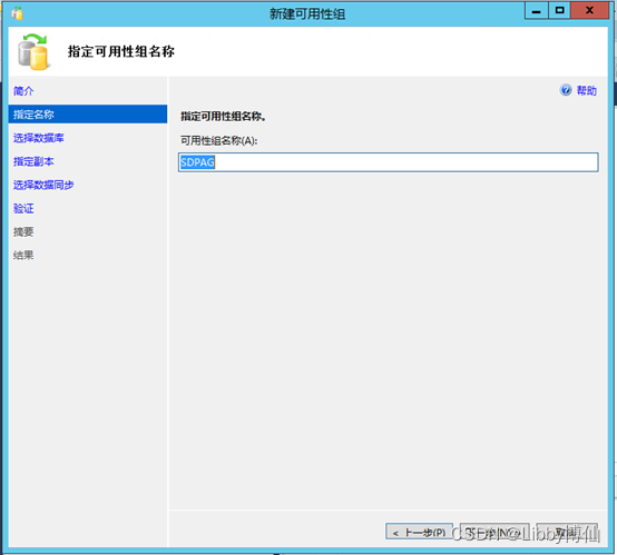 点击“下一步”,输入一个从未使用过的高可用性组名称SDPAG(之后为网络截图)