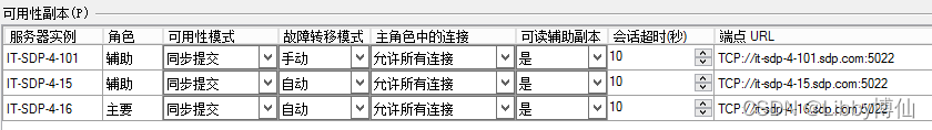 我们将辅助副本设置为可读,能够自动故障转移,同步提交模式注我们的主辅服务器都是可读为是