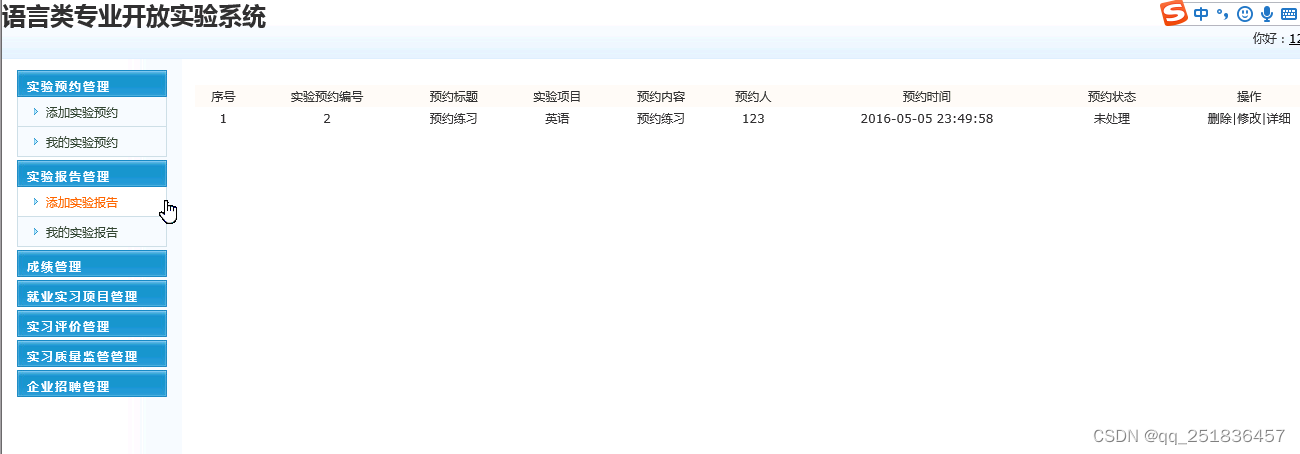 (3)实验预约管理:对实验预约信息进行添加、删除、修改和查看