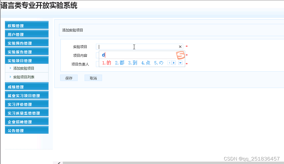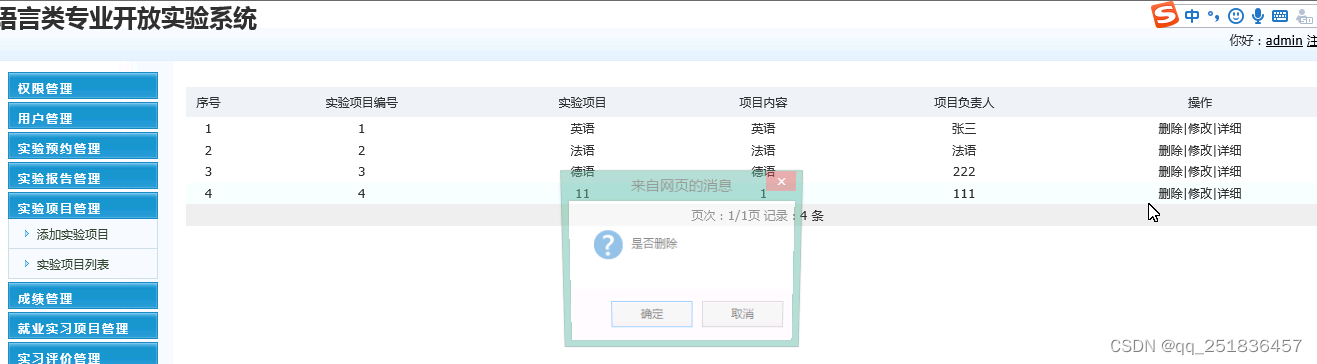 (5)实验项目管理:对实验项目信息进行添加、删除、修改和查看