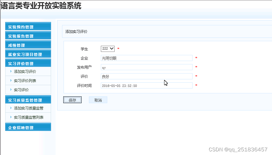 (8)实习评价管理:对实习评价信息进行添加、删除、修改和查看