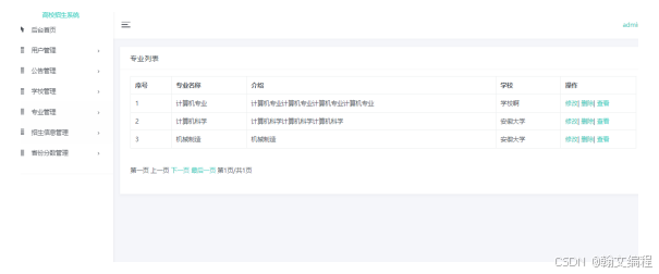 专业管理模块包括对系统内专业信息的发布,修改,查看,删除等功能。