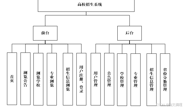 大学生管理系统主要分为用户信息管理与查看,公告信息管理与查看,学校信息管理与查看,专业信息管理与查看,招生信息信息管理与查看,省份分数信息管理与查看具体功能模块图如4.1所示: