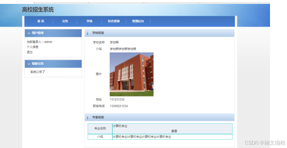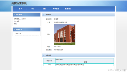 普通用户或管理员输入自己的用户账号、密码,通过身份验证后可以进入相应的管理界面首页。管理员管理页面分为用户信息管理与查看,公告信息管理与查看,学校信息管理与查看,专业信息管理与查看,招生信息信息管理与查看,省份分数信息管理与查看等功能。