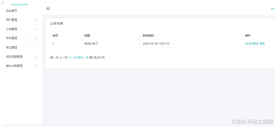 公告管理模块包括对系统内公告信息的发布,修改,查看,删除等功能。