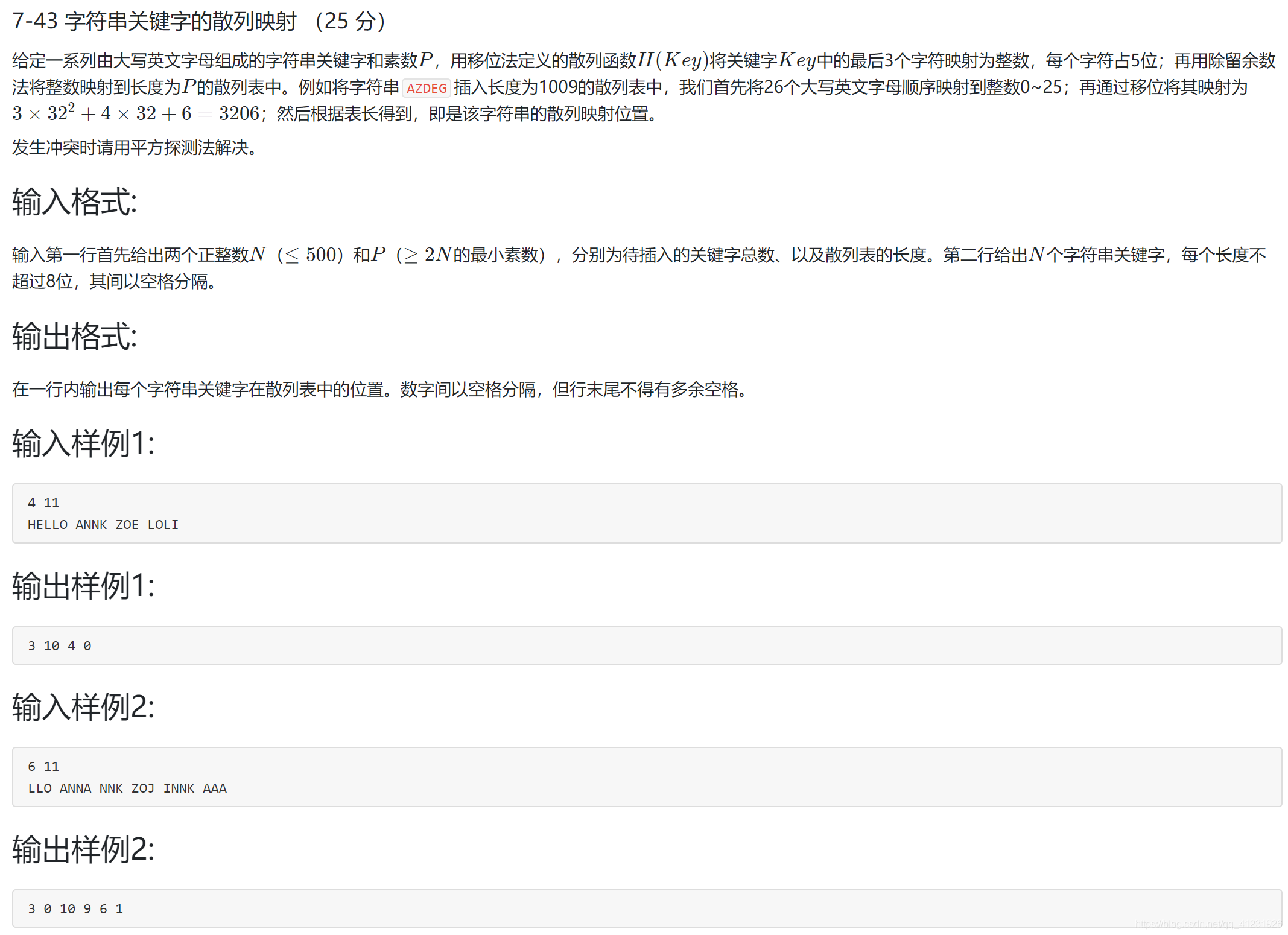 和数据结构与算法题目集7-42——整型关键字的散列映射中的注意点一样,有可能该字符串已经在哈希表中,这时候我们不需要插入,只需输出其在哈希表中的位置即可。