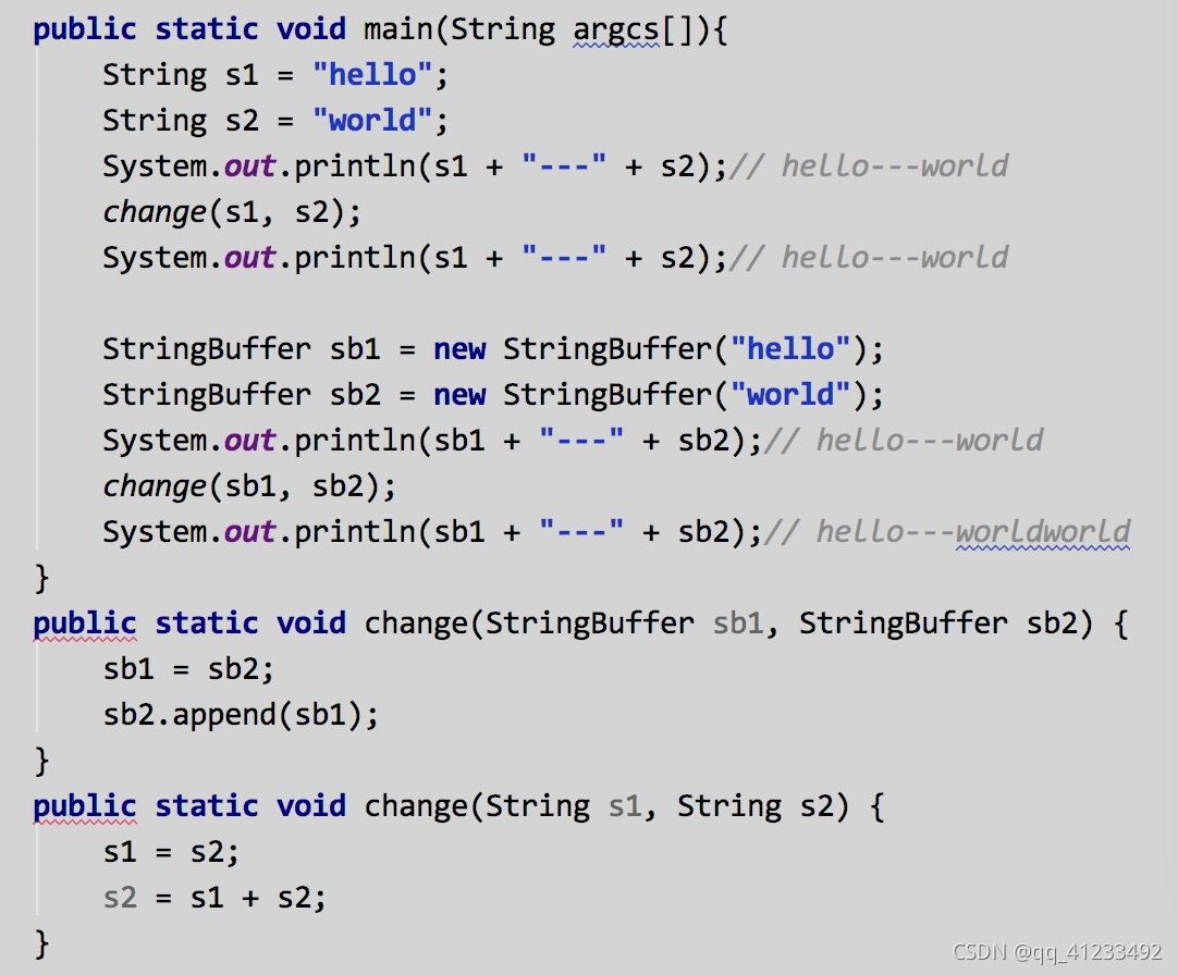这是一个最基础的值传递和引用传递的例子,你觉得好简单,已经想跃跃欲试的挑战了,那么请看下面的,StringBuffer很好理解,但是当你执行一遍之后发现是不是和预想中的输出不一样呢?String不是引用类型吗,怎么会这样呢?如果你无法理解,那么请看下String的实现源码,了解下其在内存中分配的实现原理。