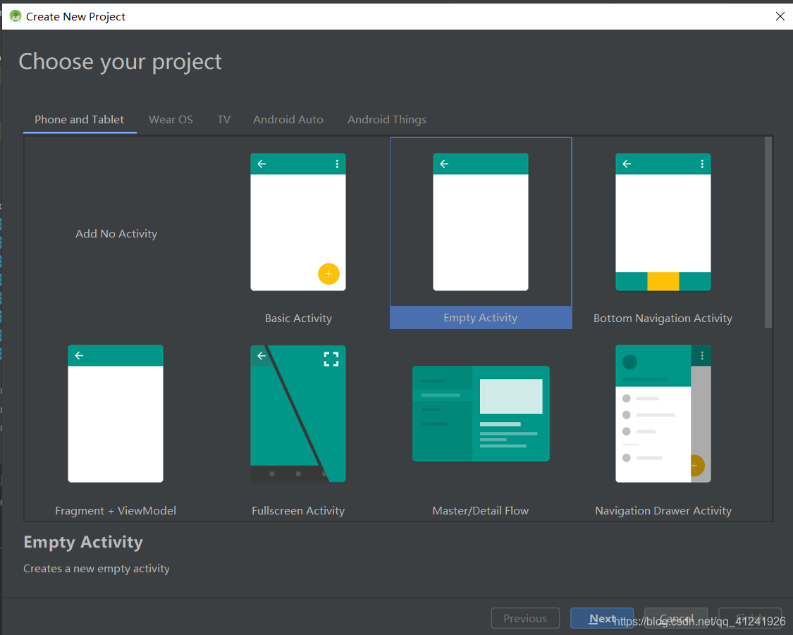 选择Empty Activity,之后填完App name之后默认选择就行。我们可以看到项目的目录如下图: