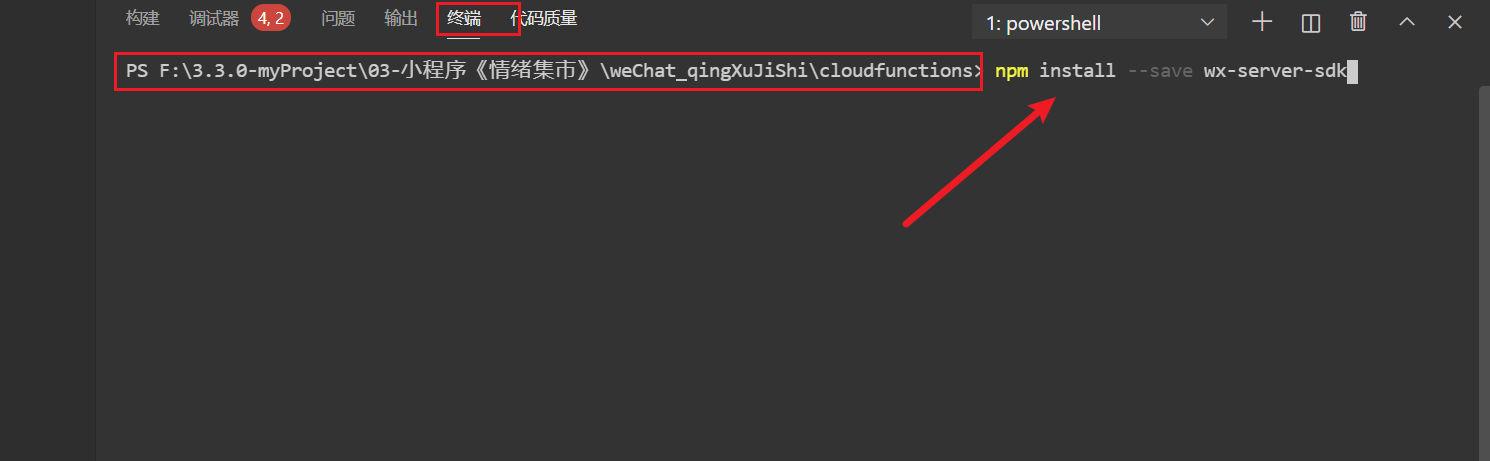 3、如果你的云函数依赖其他模块,还需要通过 npm install 命令重新安装这些模块(如果云函数没有依赖其他模块,则可以跳过这一步。)