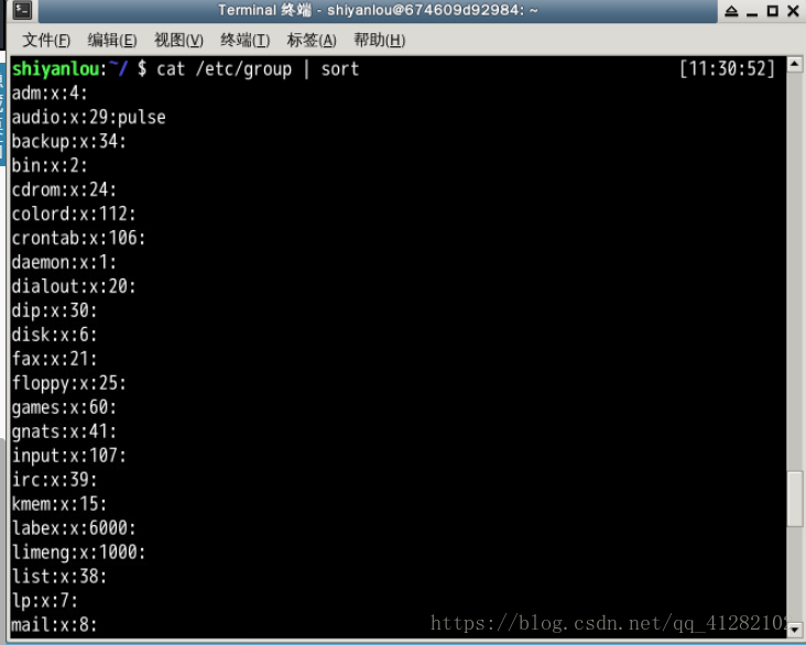这里 cat 命令用于读取指定文件的内容并打印到终端输出,后面会详细讲它的使用。 | sort 表示将读取的文本进行一个字典排序再输出,然后你将看到如下一堆输出,你可以在最下面看到 shiyanlou 的用户组信息: