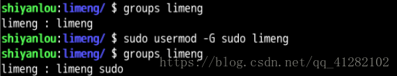 这里我用 shiyanlou 用户执行 sudo 命令将 limeng 添加到 sudo 用户组,让它也可以使用 sudo 命令获得 root 权限: